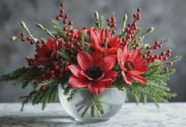Festive winter flower arrangement with red amaryllis and evergreen branches symbolizing hope and celebration during holiday season