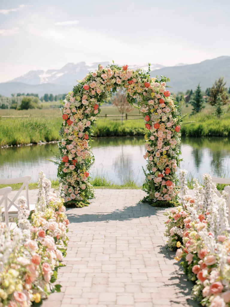 2026 wedding ceremony floral arch with hanging blooms and greenery